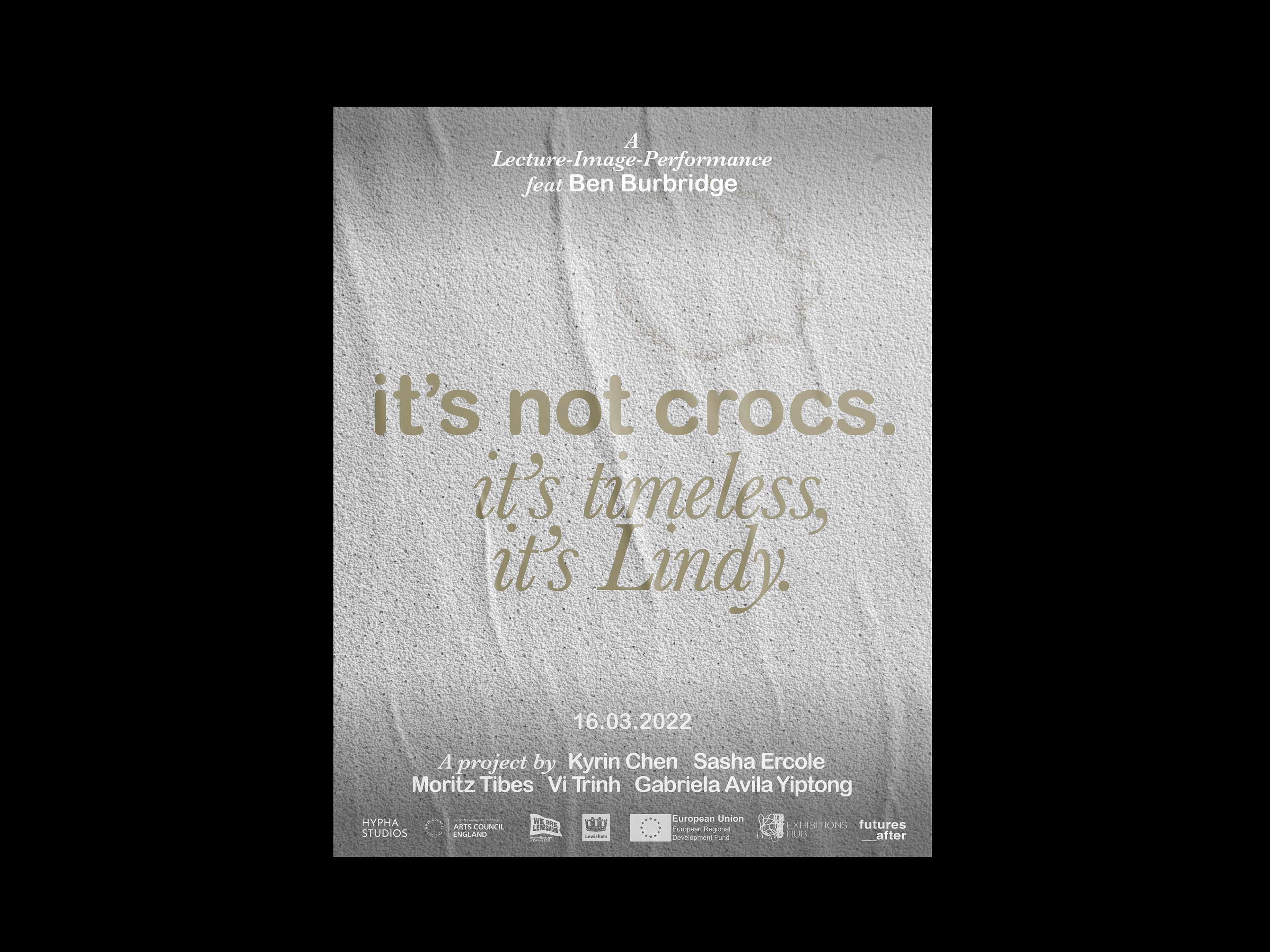 It’s Not Crocs. It’s Timeless, It’s Lindy is a collaborative artwork that took the form of a video installation, a commissioned piece of writing, and a lecture performance. The project spanned a timeframe of three months, during which a group of five artists and a theorist individually created different fragments of a co-authored work. The piece culminated in a public reading on 6 March 2022.